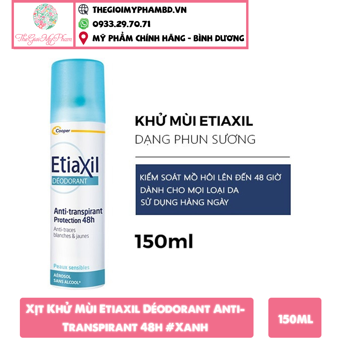 Xịt Khử Mùi EtiaXil Dạng Phun Sương 48H Màu Xanh Deodorant Anti-Transpirant Protection 48H Aérosol 150ml
