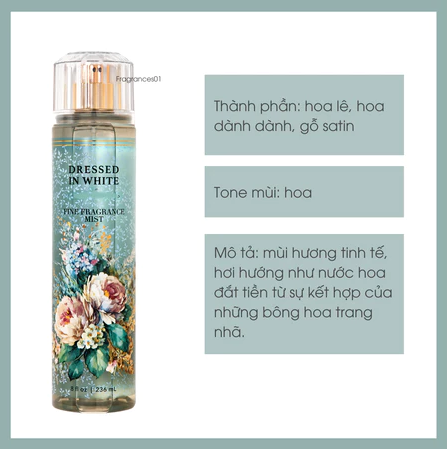 Hương thơm Dressed In White Fine Fragrance Mist là sự hòa quyện giữa hương thơm của hoa lê thơm mát, hoa dành dành màu ngà và gỗ satin tạo nên một hương thơm ấn tượng.